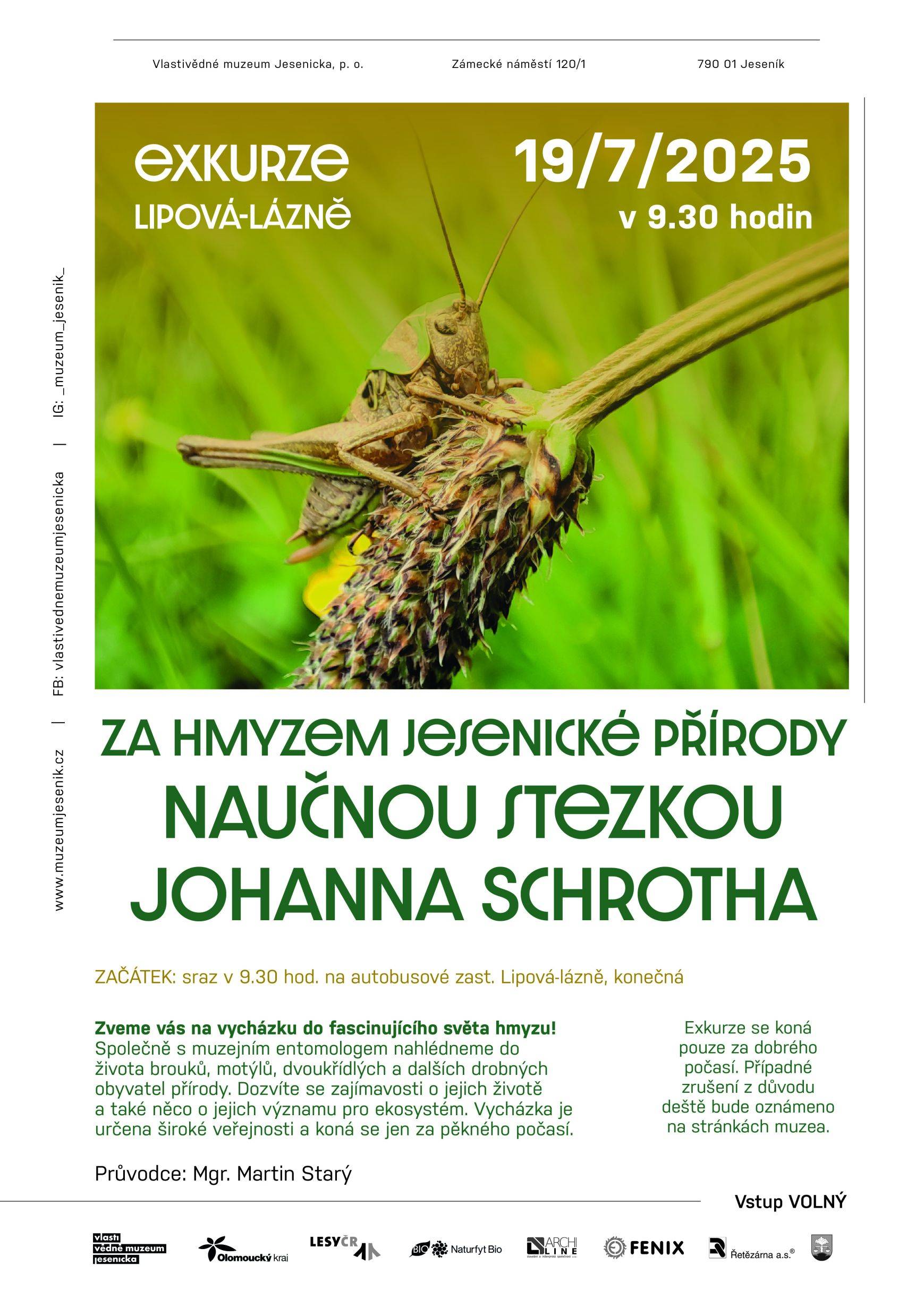 Entomologická vycházka na stezce Johanna Schrotha19.07.2025 V sobotu 19. července se uskutečnila entomologická exkurze pro veřejnost pořádaná Vlastivědným muzeem Jesenicka, kterou vedl biolog Martin Starý. Tentokrát se účastníci vydali od konečné zastávky autobusu v Horní Lipové po naučné stezce Johanna Schrotha, která vede do Muzea Johanna Schrotha v Dolní Lipové. Cílem vycházky bylo poznávání hmyzu v jeho přirozeném prostředí. Hmyz si člověk většinou spojuje jen s bzučením a drobnými křídly, ale při bližším pohledu se před námi otevře pestrý a fascinující svět. Účastníci tak měli možnost na vlastní oči vidět, jak rozmanitá je zdejší hmyzí fauna, především druhy z řádu motýlů – od známých „obyvatel“ luk až po zajímavější druhy, které na první pohled snadno přehlédneme. Během vycházky účastníci objevovali nejen krásu motýlích křídel, ale i jiného všudypřítomného hmyzu, jako jsou pestřenky nebo samotářské včely, které jsou nenahraditelnou součástí místní přírody. Pro mnohé to byl úplně nový pohled na svět, který běžně míjíme bez povšimnutí. Foto František Kreisinger | |