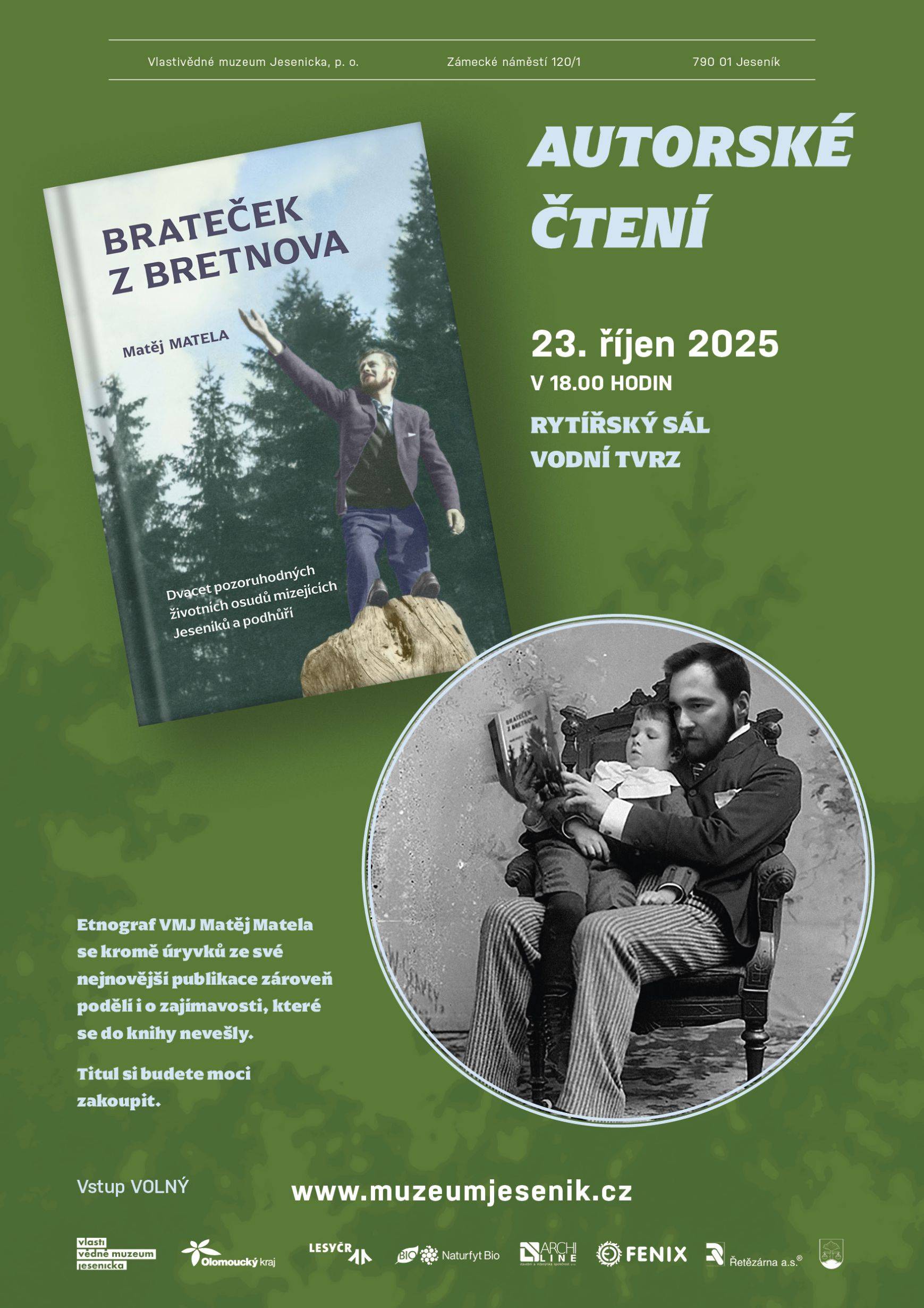 Co se do knihy Brateček z Bretnova nevešlo24.10.2025 Ve večerních hodinách 23. října se v Rytířském sále jesenické Vodní tvrze konala poněkud netradiční literární beseda. Svůj nejnovější knižní počin představil etnograf Matěj Matela z netradičního úhlu: vedle povídání o jednotlivých osobnostech knihy Brateček z Bretnova přidal i své osobní vazby k nim. „Ke každé zařazené osobnosti jsem si vytvořil určitý vztah, s každou mám spojené specifické vzpomínky či osoby, které mi s bádáním pomohly. Proto jsem se rozhodl jesenickému publiku vedle obligátního představení oné dvacítky zajímavých osudů přiblížit i tuto subjektivní rovinu titulu, která se na jeho stránky pochopitelně nedostala,“ podotkl M. Matela, který s knihou již půl roku objíždí Jeseníky a podhůří. Účastníkům tak např. prozradil, s jakými postavami Bratečka by se chtěl setkat a s kým naopak raději ne, stejně jako povyprávěl vtipné příhody i silné momenty, které při tvorbě zažil. „Zatímco má prvotina Zvoník z Cukmantlu je taková nostalgická procházka po časech zaniklé monarchie, Brateček už se posunul více do století dvacátého, kdy o tragičnost a nespravedlnosti nebyla ve střední Evropě nouze. Proto jsem se snažil tuto mnohdy neveselou rovinu, v knize zastoupenou třeba osudy dvou německých odpůrců nacismu, vyvažovat typickými jesenickými figurkami,“ podotkl autor. Pokud jste čtvrteční večer nestihli a chtěli byste si autorovo povídání vyslechnout, můžete zavítat 25. listopadu do knihovny v Krnově, 27. listopadu do rýmařovského muzea, nebo 4. prosince navštívit muzeum v Šumperku. | |