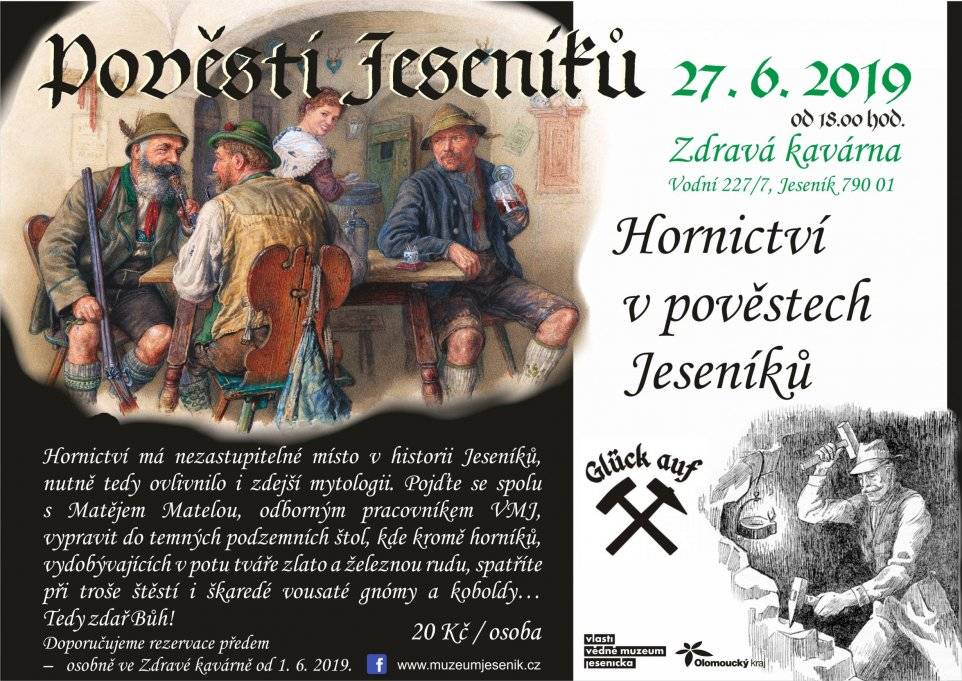 Hornictví v pověstech Jeseníků (přednáška)27.06.2019 27. června 2019, Vinárna Zdravá kavárna, přednášel Mgr. Matěj Matela Dobývání nerostných surovin hraje v dějinách našeho kraje nezastupitelnou úlohu, v podstatě lze říci, že stálo za „začátky kultury v původní divočině Jeseníků“, jak píše Josef Lowag. Hornictví tedy zákonitě silně ovlivnilo podobu zdejší mytologie. Nebyli to však pouze horníci, kdo v potu tváře vydobýval z tvrdých jesenických hor zlato a železnou rudu – pomocníky i ochránci jim byli škaredí gnómové a koboldi… Za tajemnými příběhy ze starých štol jsme se vydali spolu s Matějem Matelou, odborným pracovníkem VMJ. Tedy zdař Bůh! | |