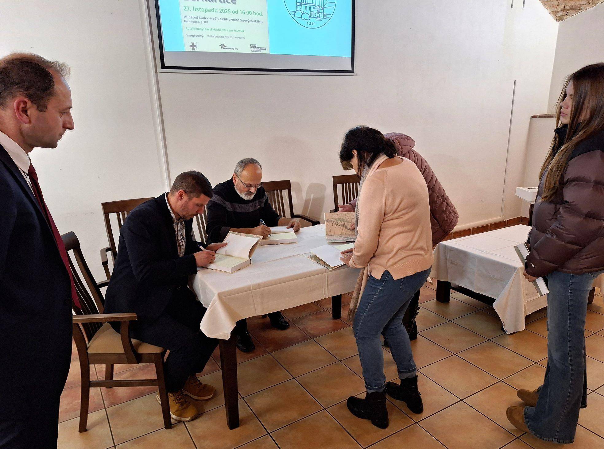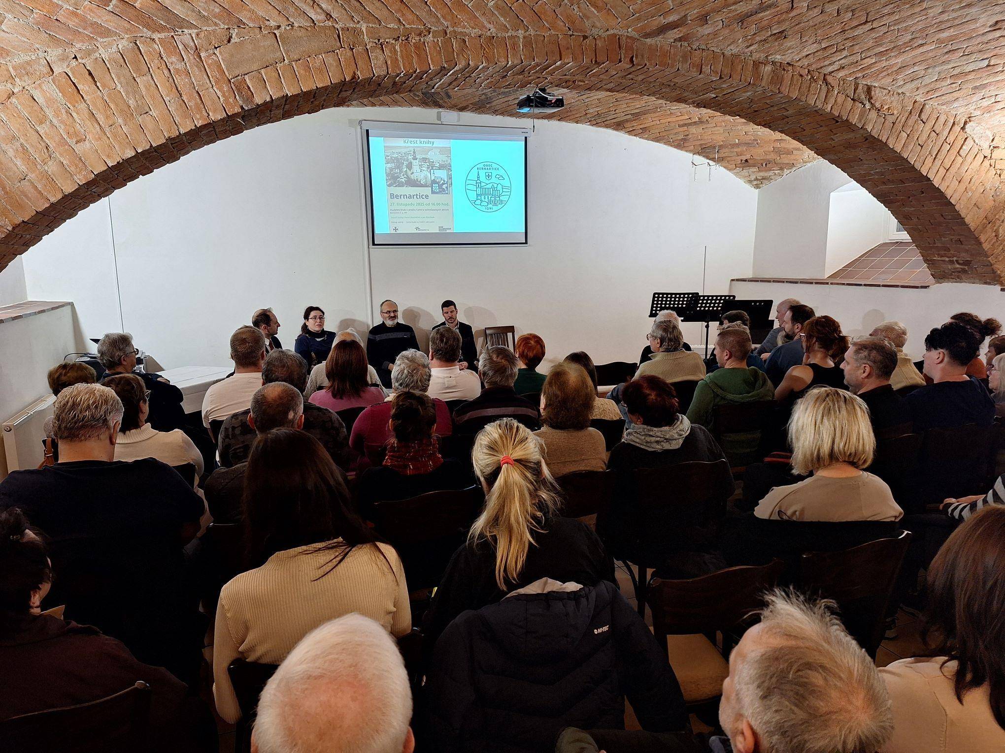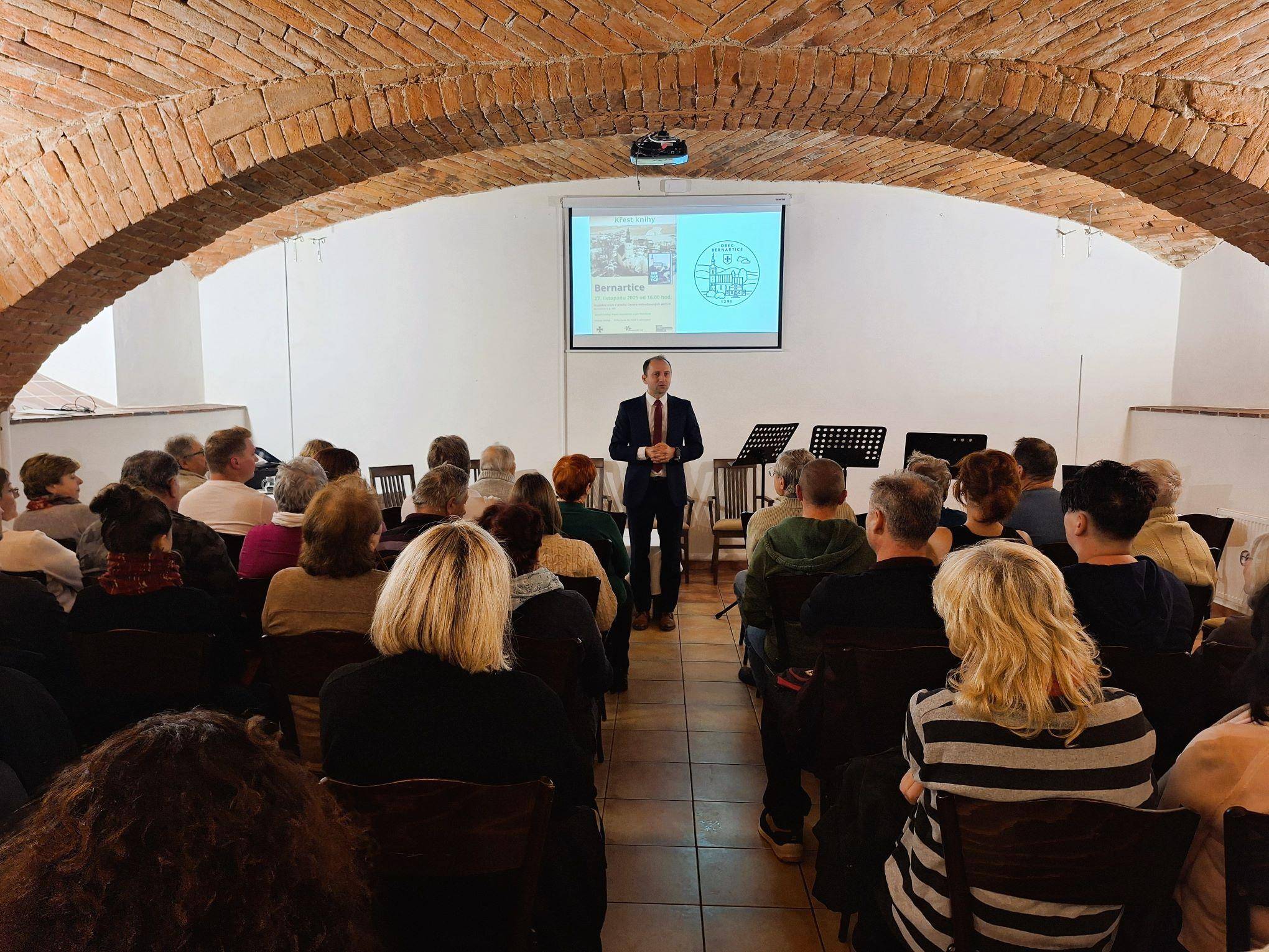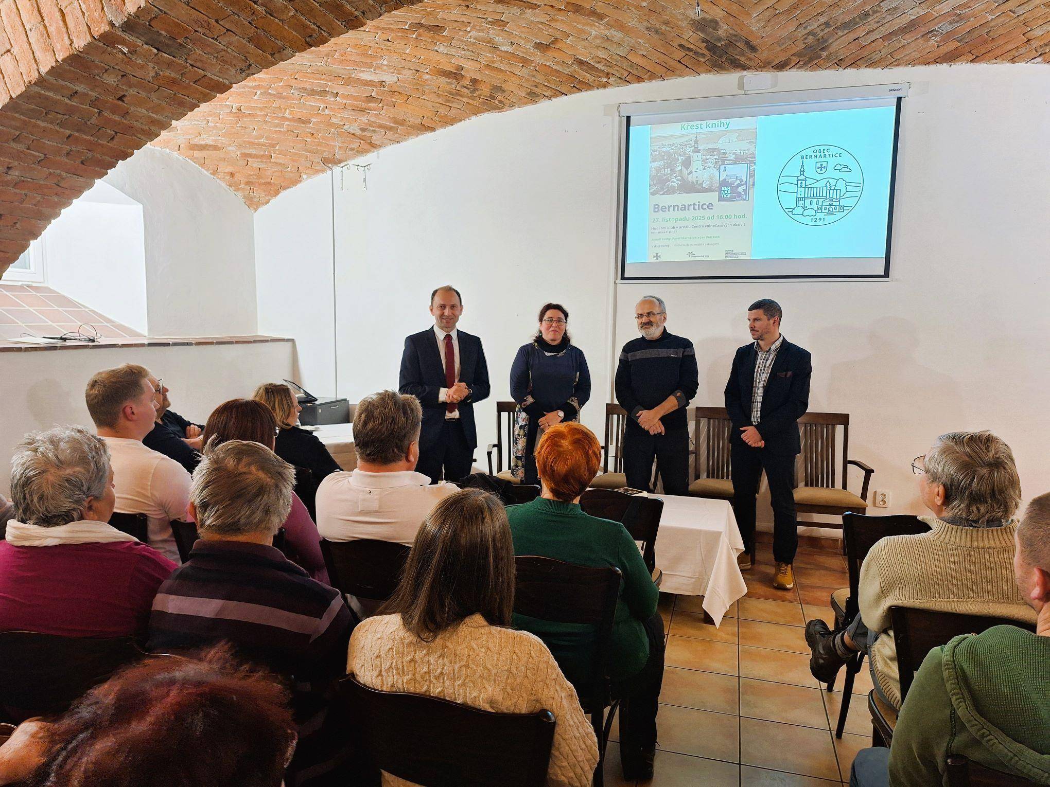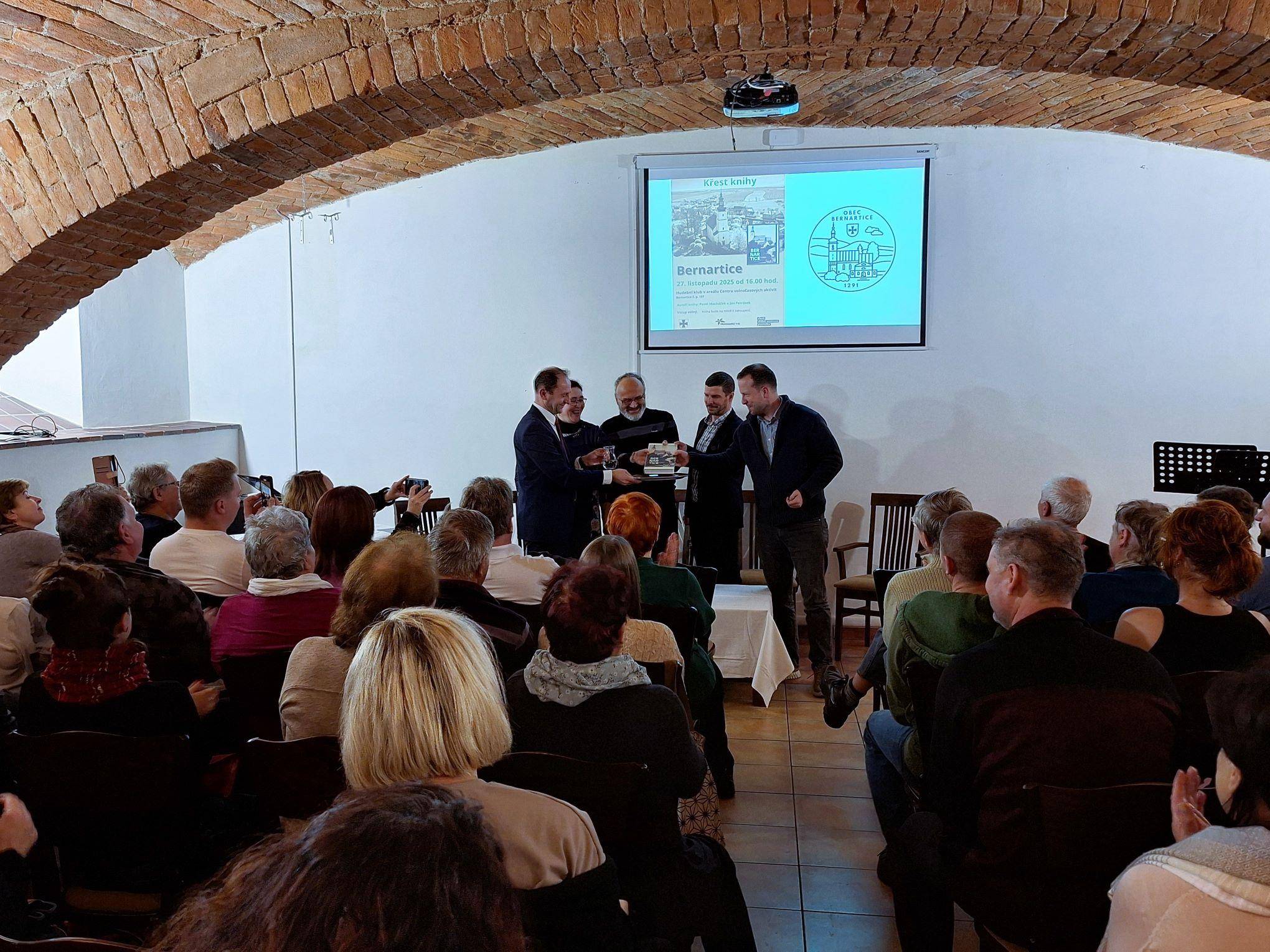 Dějiny obce Bernartice v knižní podobě27.11.2025 V Hudebním klubu v Centru volnočasových aktivit v Bernarticích byla 27. listopadu 2025 slavnostně představena a také symbolicky pokřtěna publikace o dějinách obce Bernartice autorů Jana Petráska (starší dějiny) a Pavla Macháčka (novější dějiny). Kniha zavede jak vlastivědné badatele, místní pamětníky, tak také všechny další zájemce o četbu regionálních dějin do tajů středověkých listin, raně novověkých urbářů či například kronik z moderní doby. Vyloženě bohatá je kniha na fotografie, a tak si nejeden pamětník může i zavzpomínat. Společně s ředitelem Vlastivědného muzea Jesenicka Pavlem Rušarem a oběma autory pokřtil knihu starosta obce Aleš Chromík. Zazněla různá přání, např. ať se knize dostane mnoho čtenářů, ať jsou čtenáři spokojeni, ať se nezlobí, pokud si myslí, že něco bylo jinak, či ať se kniha dočká svého pokračování např. za dalších 30 let. Za muzeum přejeme příjemné čtení a vzpomínání (nejen) bernartickým občanům. | |