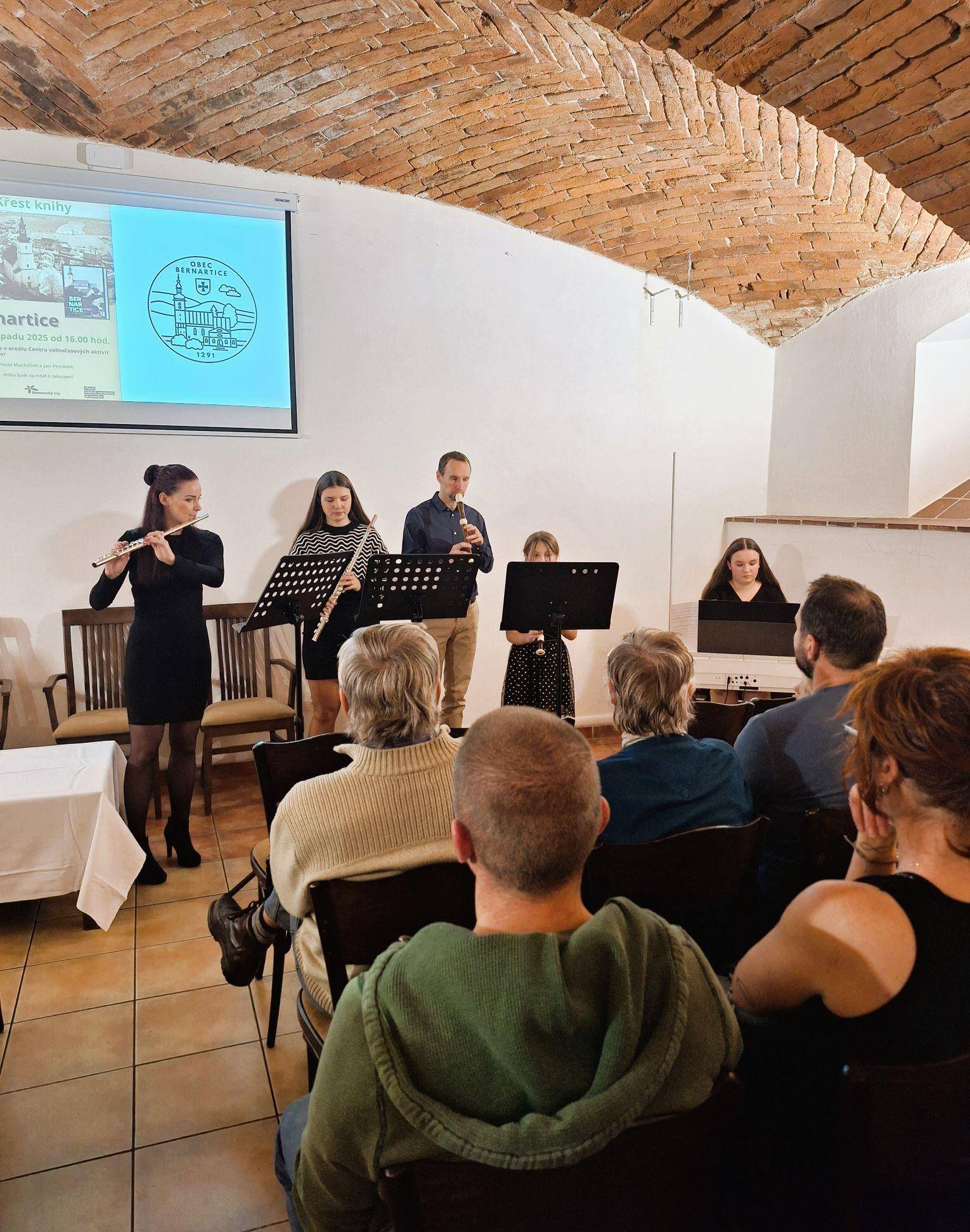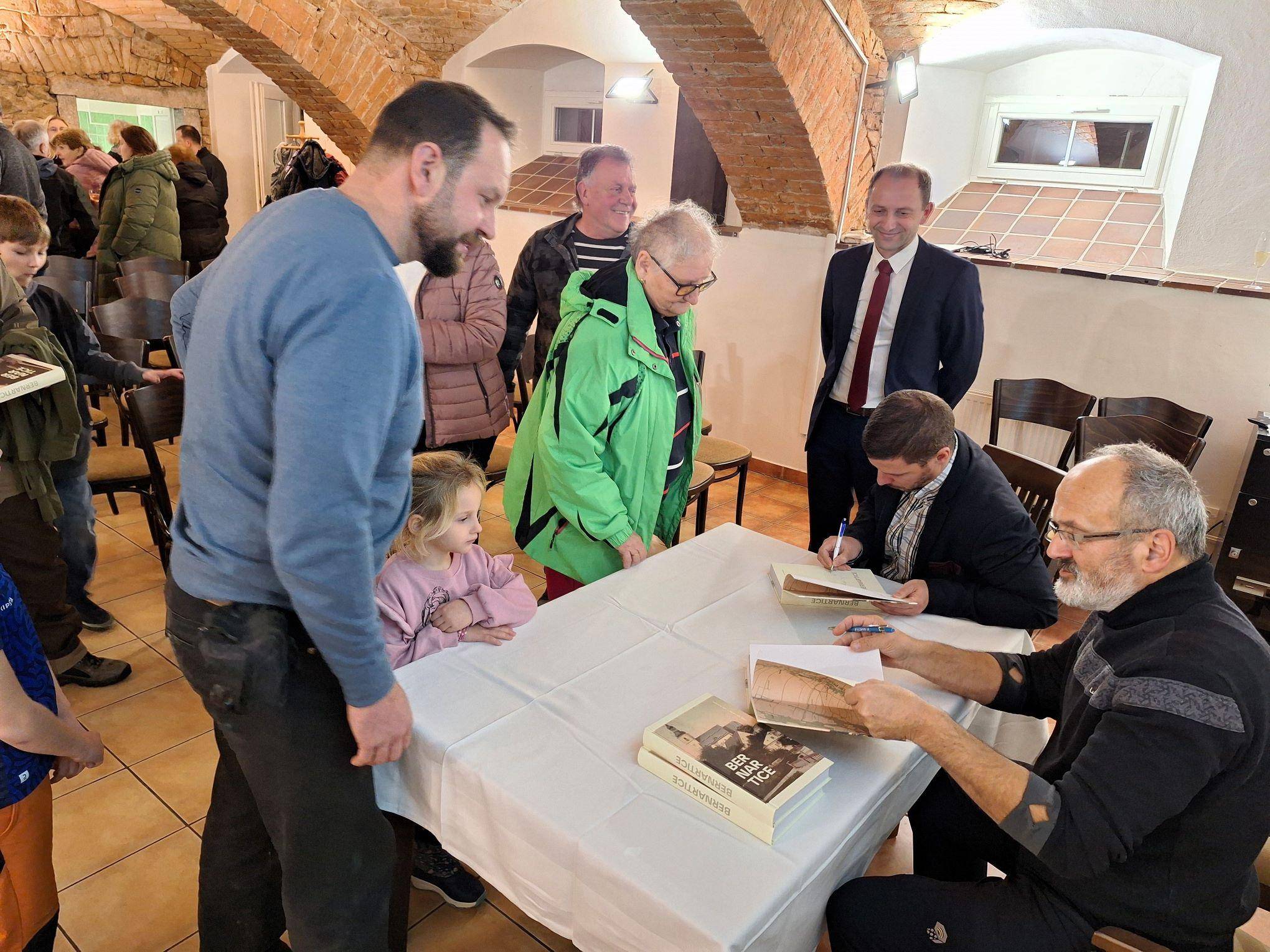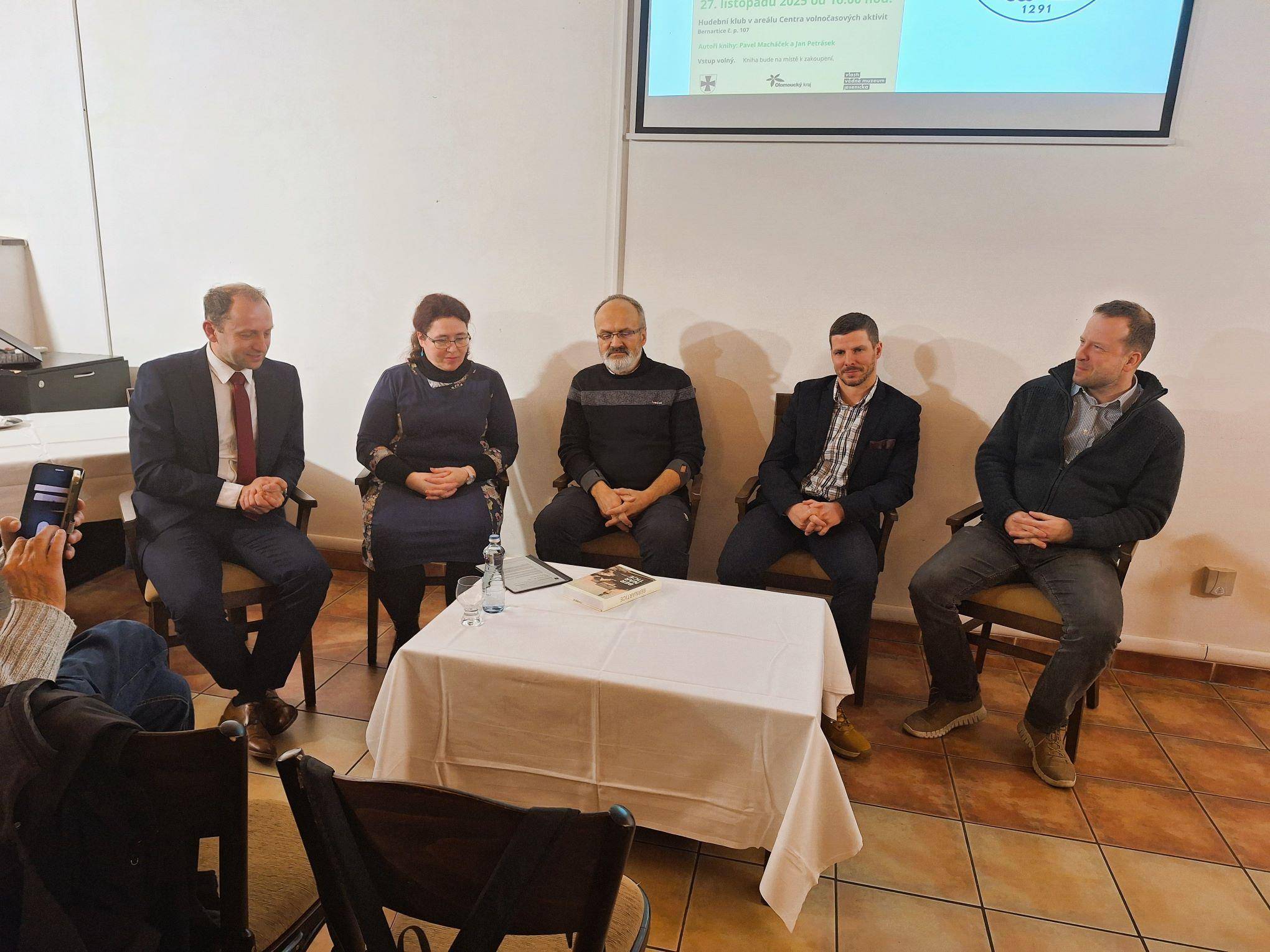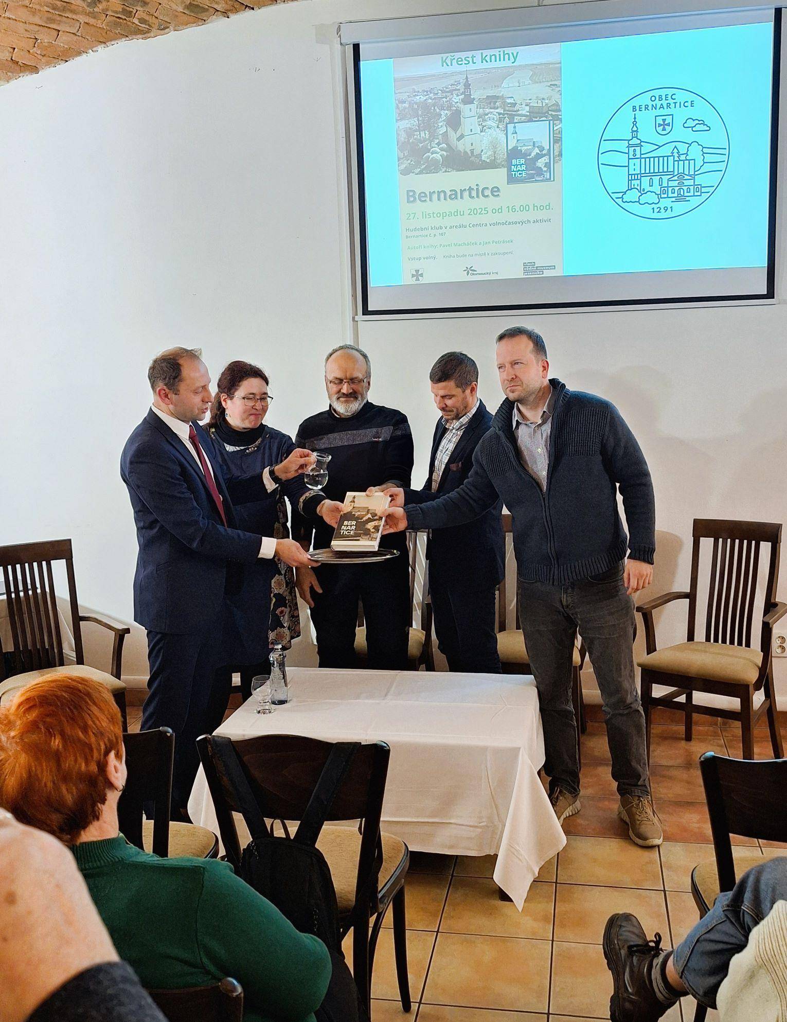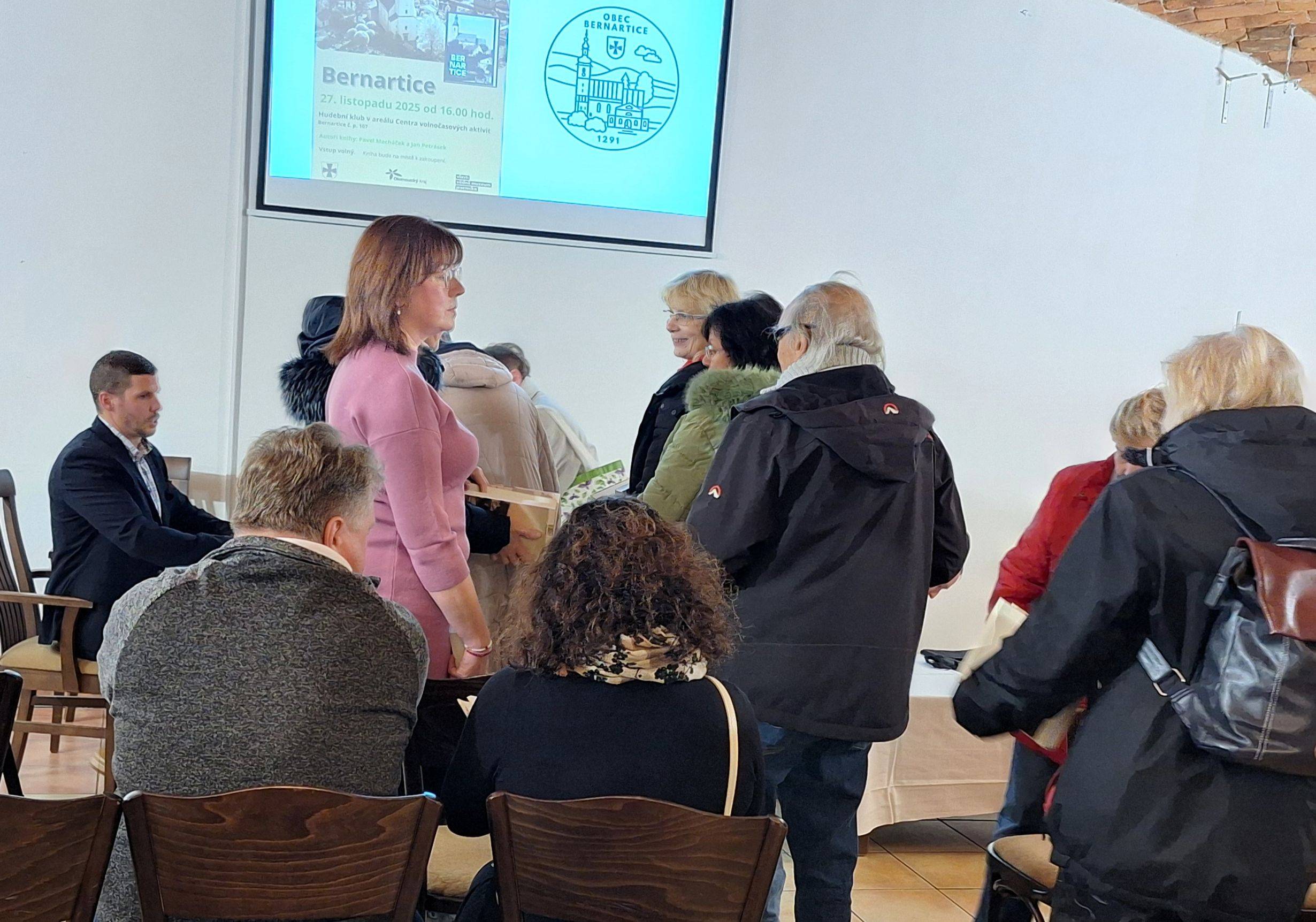 Dějiny obce Bernartice v knižní podobě27.11.2025 V Hudebním klubu v Centru volnočasových aktivit v Bernarticích byla 27. listopadu 2025 slavnostně představena a také symbolicky pokřtěna publikace o dějinách obce Bernartice autorů Jana Petráska (starší dějiny) a Pavla Macháčka (novější dějiny). Kniha zavede jak vlastivědné badatele, místní pamětníky, tak také všechny další zájemce o četbu regionálních dějin do tajů středověkých listin, raně novověkých urbářů či například kronik z moderní doby. Vyloženě bohatá je kniha na fotografie, a tak si nejeden pamětník může i zavzpomínat. Společně s ředitelem Vlastivědného muzea Jesenicka Pavlem Rušarem a oběma autory pokřtil knihu starosta obce Aleš Chromík. Zazněla různá přání, např. ať se knize dostane mnoho čtenářů, ať jsou čtenáři spokojeni, ať se nezlobí, pokud si myslí, že něco bylo jinak, či ať se kniha dočká svého pokračování např. za dalších 30 let. Za muzeum přejeme příjemné čtení a vzpomínání (nejen) bernartickým občanům. | |