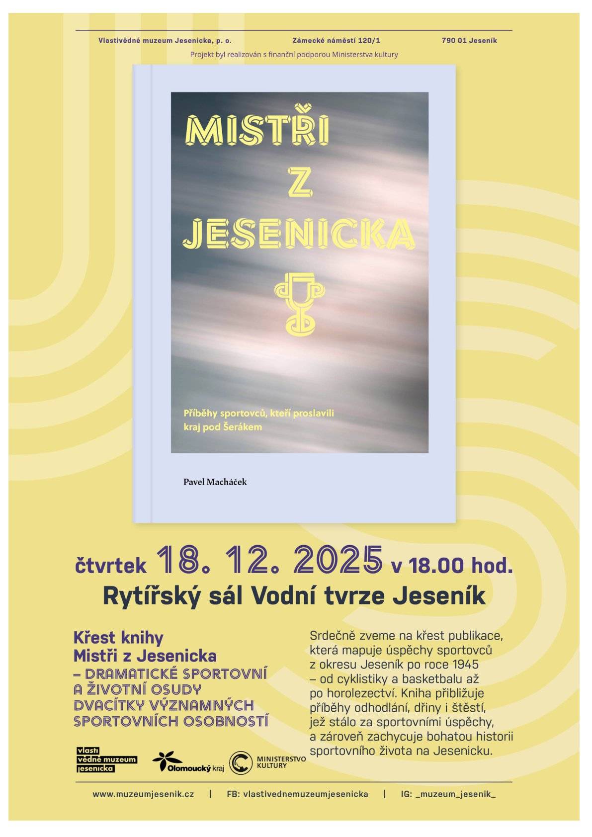 Křest publikace Mistři z Jesenicka18.12.2025 Potkáváte je jako fyzioterapeutky, záchranáře, zdravotnice, hasiče, pracovníky státních a obecních úřadů nebo vedoucí rodinných firem... Většinou ani netušíte, že jde o olympioniky, mistry světa a Evropy, držitele domácích mistrovských titulů nebo rekordmany ve svých disciplínách. Žijí totiž obyčejným životem obyvatel pohraničního koutu naší republiky. Žijí v něm, protože ho mají rádi, a pokud se již vydali do světa, rádi se sem vracejí, neboť pod Šerákem mají své kořeny. O kom je řeč? O dvacítce sportovců z Jesenicka, kteří se dokázali prosadit na nejvyšší úrovni. Někteří z nich ještě reprezentují Českou republiku nebo rozdávají trenérské zkušenosti na mezinárodní úrovni. Poctou jejich talentu, odříkání, sportovnímu úsilí a nezlomné vůli se stala publikace „Mistři z Jesenicka“, jejíž křest proběhl ve čtvrtek 18. prosince v Rytířském sále Vodní tvrze. Knihu, jež je první vlaštovkou na poli mapování významných úspěchů jesenických sportovců, napsal Pavel Macháček a vydalo ji Vlastivědné muzeum Jesenicka s podporou Ministerstva kultury ČR. | |
