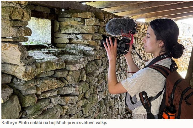 Z Pensylvánie na Jesenicko. Příběh, který vrátil hlas zapomenutým vojákům05.01.2026 Americká studentka filmu Kathryn Pinto přijela do Česka původně jen na tříměsíční stáž v rámci programu CzechMates. Společně s kolegy ze Signum Belli 1914 se nám ji však podařilo zapřáhnout i před muzejní kočár a její pobyt se proměnil v hluboký ponor do dějin první světové války, a zejména do osudů vojáků spjatých s Jesenickem. Výsledkem byl dokumentární film podpořený Ministerstvem obrany ČR Zapomenuté osudy vojáků z Jesenicka 1914–1918. Právě práce s autentickými osudy, archivními materiály a pamětí rodin ji zcela pohltila. Podílela se na natáčení, střihu i režii a navzdory jazykové bariéře dokázala ve spolupráci se scénáristou vytvořit citlivý film, který připomíná zapomenuté lidské příběhy Velké války.Více informací nalezne zájemce na odkaze. S Kathrytn Pinto budeme ve Vlastivědném muzeu Jesenicka dále spolupracovat, již nyní se připravuje další filmový projekt, a to opět s válečnou tematikou, nikoliv však již orientovanou jen na první světovou válku. Regionální zaměření samozřejmě zůstane. | |