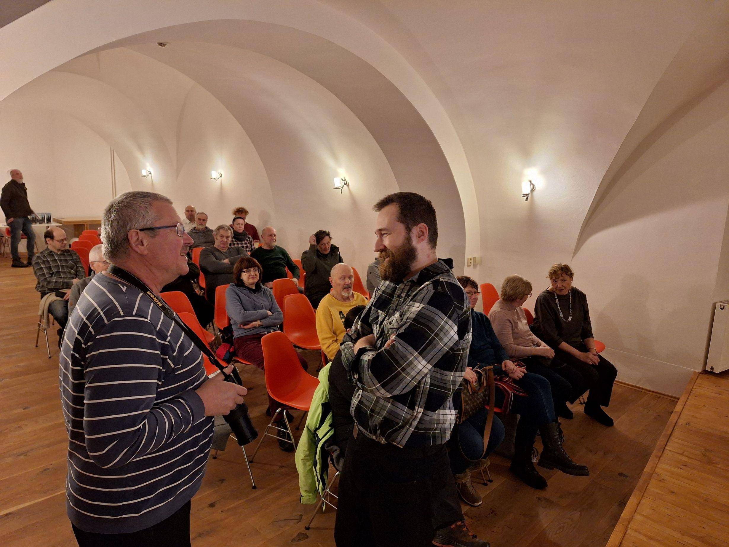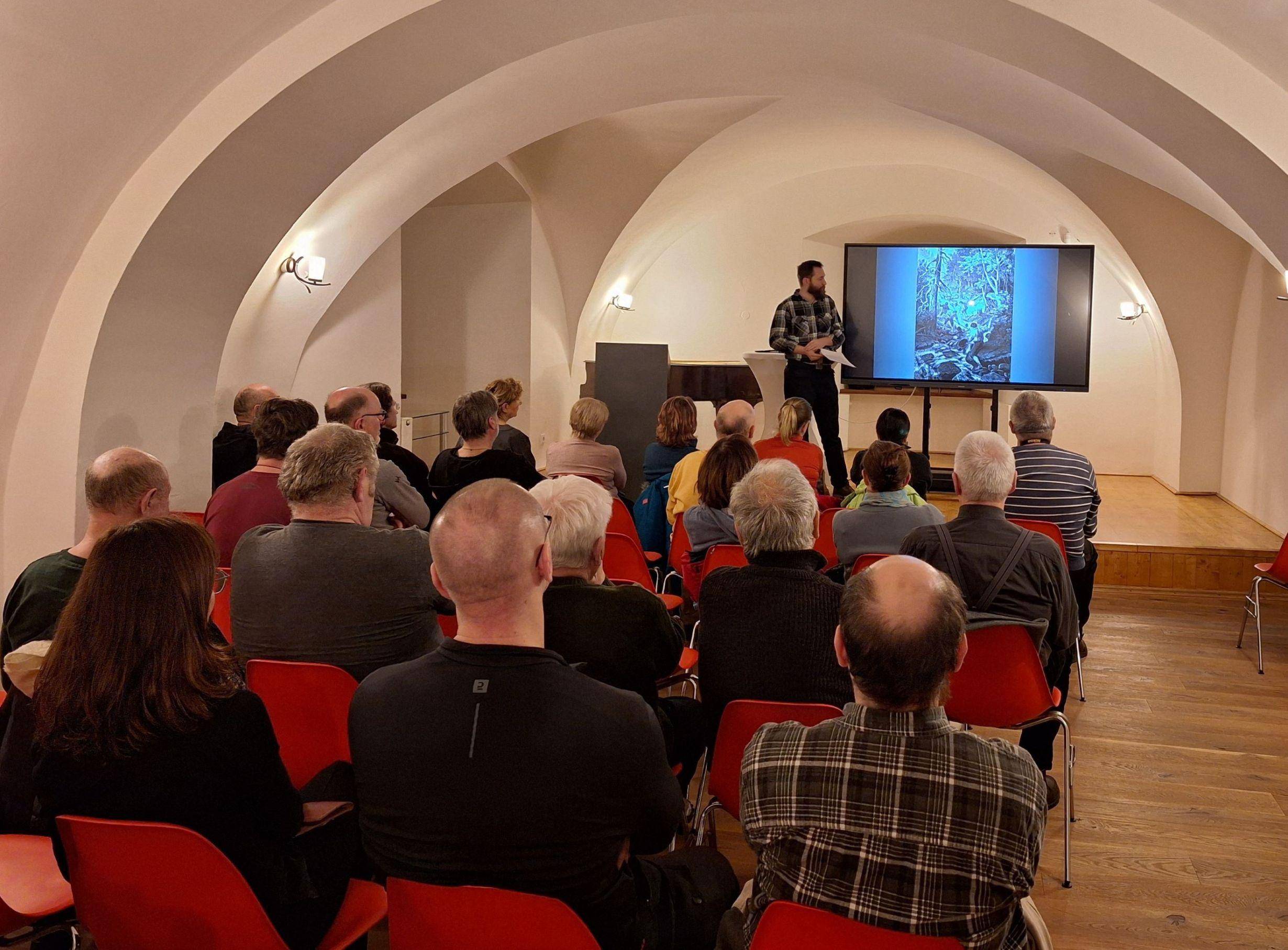 Jak se plavilo dřevo pod Pradědem i v Severní Americe?22.01.2026 Na tuto otázku odpověděl 22. ledna v Rytířském sále Vodní tvrze etnograf našeho muzea Matěj Matela, který zhruba třicítku zájemců o tematiku splavování volného dřeva přenesl nejen do starých Jeseníků, ale i za oceán. Porazit strom, zbavit jej větví a případně jej rovnou i nařezat bývalo v časech před druhou světovou válkou mnohonásobně náročnější činností, než je tomu dnes. Zmíněné skácení a odvětvení však patřilo k těm méně obtížným fázím těžby dřeva. Ta pravá síla a obratnost se totiž plně projevily až ve chvíli, kdy bylo třeba transportovat dříví z lesního porostu. Jako jeden ze způsobů se nabízelo využít síly vodních toků. M. Matela přiblížil historii tohoto řemesla obecně, podrobně se rozhovořil o jeho technických náležitostech a poté se již zaměřil na jesenické hory, jejichž dravé bystřiny odnesly pomocí tzv. klauz, tedy splavovacích nádrží, statisíce sáhů dříví. Na závěr se pak účastníkům dostalo překvapení v podobě povídání o plavení dřeva ve Spojených státech amerických a Kanadě, doplněné o dobové záběry, na nichž obratní muži v károvaných košilích předvádějí neuvěřitelné výkony. | |