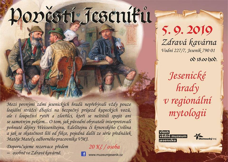 Jesenické hrady v regionální mytologii (přednáška)05.09.2019 5. září 2019, Vinárna Zdravá kavárna, přednášel Mgr. Matěj Matela Jen málokde v České republice najdeme tak hustou soustavu zřícenin strážních hrádků jako právě v Jeseníkách. Mezi pevnými kamennými zdmi však v dávné minulosti nepřebývali pouze poctiví a loajální strážci dbající na bezpečný průjezd kupeckých vozů, ale také loupeživí rytíři a všelijací zlotřilí jedinci, z nichž mnozí využívali pomoci samotného pekla... Jakým způsobem původní obyvatelé interpretovali pohnuté dějiny Koberštejnu, Edelštejnu, Rabenštejnu či krnovského Cvilína a jak se historická skutečnost liší od fikce, o tom pojednávala další ze série přednášek Matěje Mately. | |