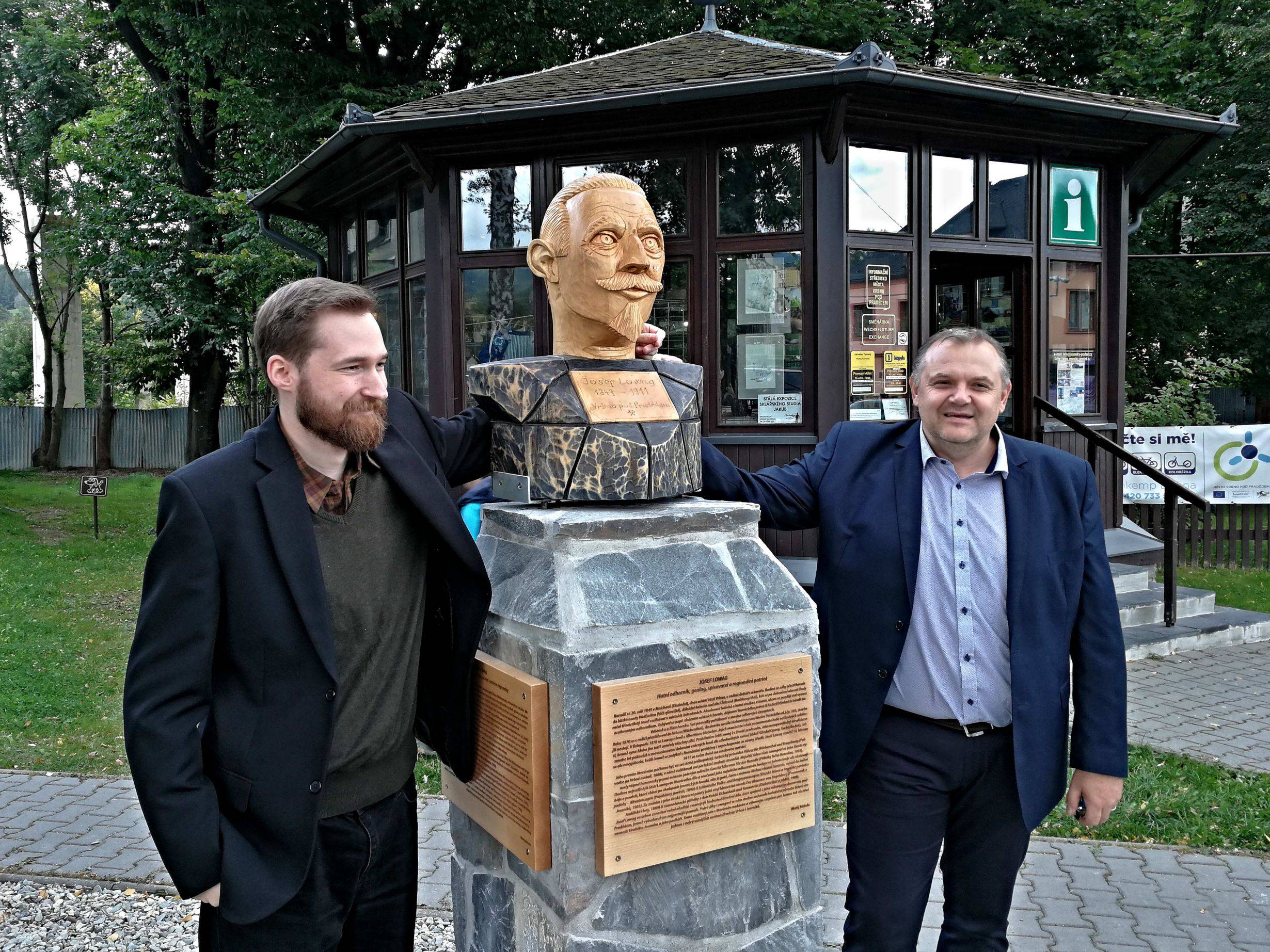 Vrbenské centrum zkrášlila dřevěná busta Josefa Lowaga20.09.2019 V pátek 20. září 2019 v 16.00 proběhlo před informačním centrem ve Vrbně pod Pradědem slavnostní odhalení dřevěné busty Josefa Lowaga, významné osobnosti celého regionu narozené přesně před 170 lety. Vznik pomníku inicioval Matěj Matela, odborný pracovník našeho muzea, který se Lowagovým životem a dílem dlouhodobě zabývá (tento rok např. připravil šest dílů jesenických pověstí, z nichž čtyři večery již proběhly ve Zdravé kavárně). Josef Lowag spatřil světlo světa 20. září 1849 v Mnichově (Einsiedel), dnes místní části Vrbna, s rodinou se záhy přestěhoval do nedaleké osady Wolfseifen (Vlčí rýžoviště) nad obcí Železná (Buchbergsthal). Po dokončení obecné školy se začal vzdělávat v místních železárnách. Absolvoval báňská a hutní studia a v tomto oboru se stal oceňovaným odborníkem (zabýval se kupř. složením místních hornin či historií těžebních lokalit na Vrbensku a Zlatohorsku). V roce 1870 se s rodiči přestěhoval do Vrbna (Würbenthal), v listopadu 1876 se pak oženil s Albertinou Hatscher. Jejich manželství bohužel poznamenala řada nešťastných událostí, kromě syna Aloise jim totiž zemřely všechny děti. Problémům čelil Lowag i v životě profesním. Jako celoživotní idealista se řadu let pokoušel o znovuobnovení dolování vzácných kovů dle středověkých metod, což se ale nevyplácelo, kvůli čemuž se potýkal s finančními problémy. Zemřel 14. března 1911 na mozkovou mrtvici. Jeho prvním literárním počinem byl turistický průvodce Führer für Würbenthal und Umgebung (Průvodce po Vrbně a okolí, 1888), největší slávu mu však za jeho života vynesly vtipné humoresky psané místním nářečím Geschichtla vom Förster Benedix (Příběhy fořta Benedixe, 1910). Dodnes nejvzácnější částí Lowagova literárního díla a zároveň jeho největším odkazem do budoucna tohoto kraje ale zůstávají báje a pověsti, které sbíral po chalupách jesenických horalů, aby je poté, často s notnou dávkou vlastní fantazie, sepsal do knižní podoby – Altvatersagen (Pradědovy pověsti, 1890) či Schlesische Volks- und Bergmannssagen (Slezské lidové a hornické pověsti z Jeseníků, 1903). Právě díky Lowagovi se nám dodnes zachovalo bohatství původní lidové slovesnosti Hrubého Jeseníku a jeho podhůří. Realizaci slavnostního ceremoniálu finančné zaštítilo město Vrbno pod Pradědem. Bustu zhotovil Ivan Láňo, který svým lehce karikaturním stylem výborně navázal na práce starých sudetských řezbářů tohoto kraje (viz kupř. slavné židle v rejvízské hospodě). Podstavec vystavěli pracovníci firmy Zemní práce Naděžda Klíčová. Samotný ceremoniál zahájil Pěvecký sbor města Vrbna, jehož členové zazpívali dvě písně. Poté promluvil starosta Petr Kopínec, jenž poděkoval všem, kteří se na výrobě památníků podíleli. Následně předal slovo Matěji Matelovi, který krátce pohovořil o osobě Josefa Lowaga. Zároveň tento akt nazval velkým krokem vpřed, neboť ještě před deseti lety by pomník německé osobnosti na území bývalých Sudet jen těžko vznikl. Po obou projevech byla busta slavnostně odhalena a ceremoniál opět zakončen písněmi. | |