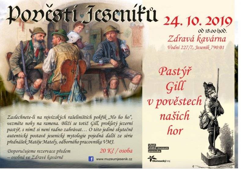 Pastýř Gill v pověstech našich hor (přednáška)24.10.2019 24. října 2019, vinárna Zdravá kavárna, přednášel Mgr. Matěj Matela Ho ho ho! Jestliže při toulkách tajemnými rašeliništi na Rejvízu zaslechnete tento zlověstný pokřik, pak vězte, že nevezmete-li ihned nohy na ramena, se zlou se potážete. Blíží se totiž Gill… Legendární jezerní pastýř (něm. Seehirt), jenž byl za znesvěcení Božího daru proklet, představuje v oblasti jesenické mytologie skutečný poklad, neboť se jedná o jedinou veskrze původní a autentickou postavu těchto hor. O tomto škaredém hrbatém přízraku, který však dokáže i pomoci, pojednávala další z přednášek Matěje Mately, odborného pracovníka VMJ. | |