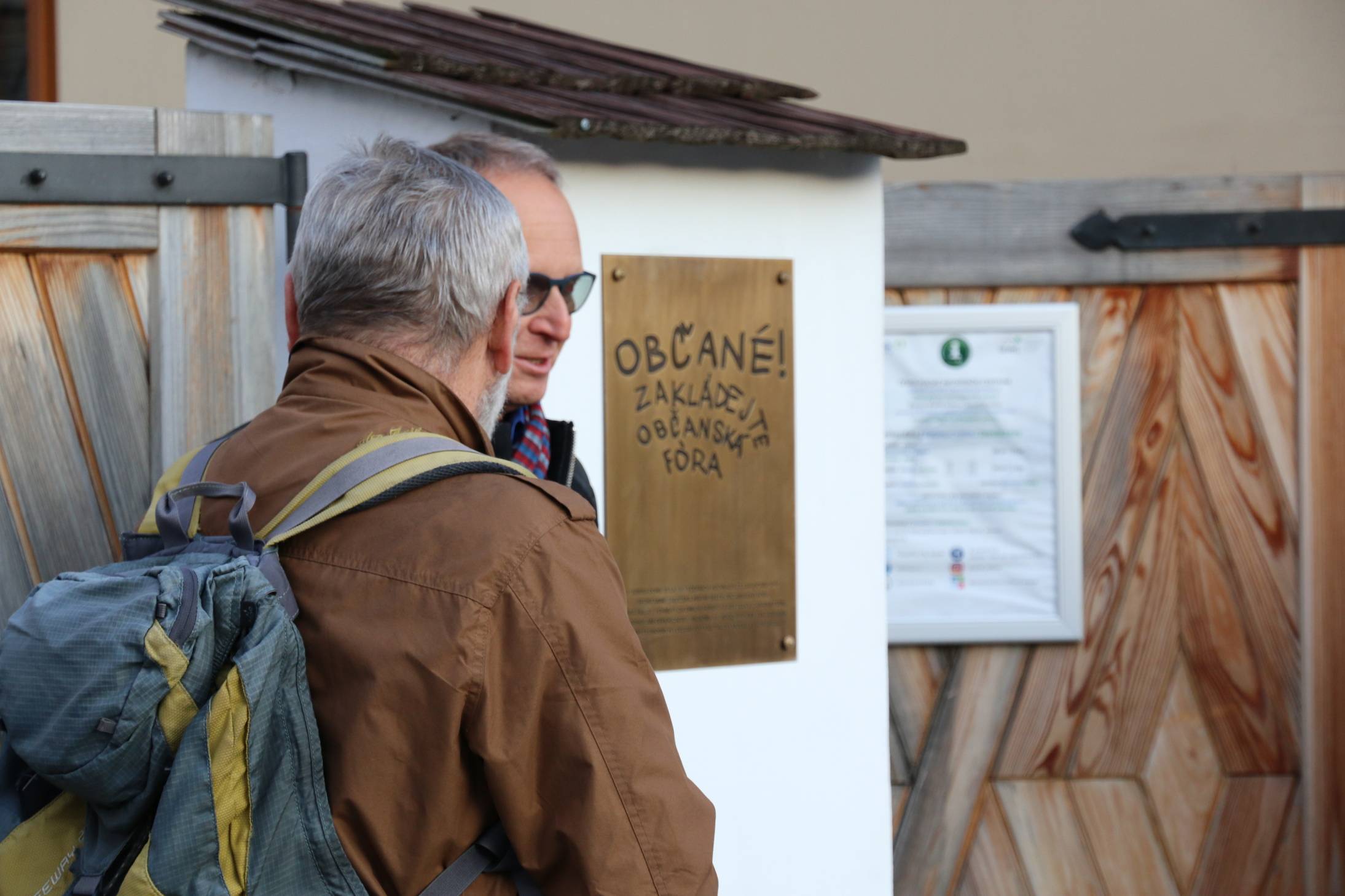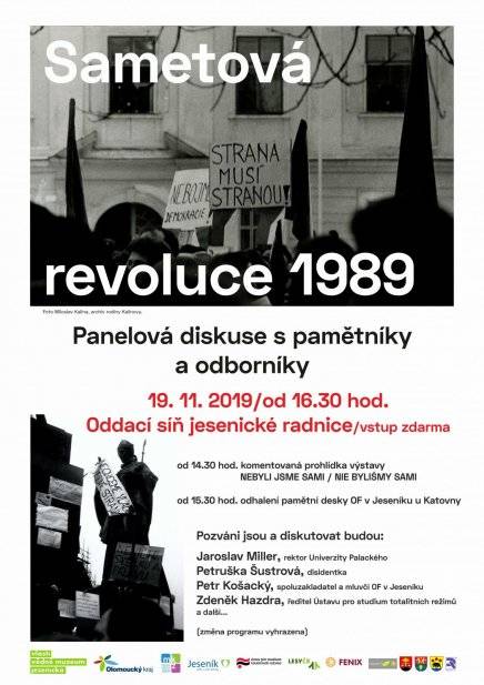 Vzpomínkové akce připomenuly Sametovou revoluci v Jeseníku i obecně19.11.2019 Hlavním tématem letošního listopadu se přirozeně staly události roku 1989, kdy se státy střední a východní Evropy vymanily z područí SSSR a vykročily na cestu demokracie. Stranou oslav nezůstalo ani naše muzeum, které ke 30. výročí konce totality připravilo, spolu s Městem Jeseník a Městskými kulturními zařízeními, hned několik akcí. Přestože připomínky revoluce začaly již v říjnu slavnostním otevřením česko-polské výstavy „Nebyli jsme sami / Nie byliśmy sami“ v galerii Vodní tvrze, hlavní období oslav nastalo přirozeně až v druhé půli listopadu, za VMJ konkrétně 19. 11. Program obsahoval tři hlavní části. Tou první byla komentovaná prohlídka výstavy ve 14.30 hod., kterou vedl její spoluautor Matěj Matela. Svoji pozornost tentokrát zaměřil především na okolnosti polského boje proti totalitě a na spolupráci československých a polských opozičníků. Následně, v 15.30, proběhla za Katovnou druhá část slavnostního dne, a to odhalení pamětní desky připomínající 30. výročí vzniku jesenické sekce Občanského fóra. Na počátku zazněly česká a slovenská hymna v podání učitelky místní ZUŠ paní Anny Beťákové. Úvodní slovo pronesla starostka paní Zdeňka Blišťanová, která poděkovala VMJ a MKZ za realizaci tohoto projektu a samozřejmě také přítomným účastníkům jesenické revoluce, kteří stáli u založení místního OF, tedy Petru Košackému a Ladislavu Hajnému. Oba si následně vzali slovo a zavzpomínali nejen na pohnuté dny listopadu a prosince 1989, ale zároveň vyjádřili vděk za dobu, v níž již tři desetiletí žijeme. Matěj Matela připomněl, že OF v Jeseníku vzniklo již 21. listopadu, na což můžeme být vzhledem k perifernímu charakteru oblasti právem hrdi. Poté již oba bývalí mluvčí jesenického OF pamětní desku odhalili. Podobu díla navrhl výtvarník Filip Raif, který se inspiroval jedním z dobových hesel. Třetím bodem programu se stala panelová diskuse, jež proběhla v oddací síni jesenické radnice. Na počátku vystoupil ředitel VMJ Pavel Rušar, který přivítal jednotlivé diskutující – Petra Košackého, dále někdejší významnou disidentku a nynější novinářku Petrušku Šustrovou a historika Ondřeje Koláře ze Slezského zemského muzea. Moderování se ujal Martin Tichý z Ústavu pro studium totalitních režimů, který se zabývá novodobými československými dějinami a protikomunistickým odbojem. Dvouhodinová diskuse se záhy přesunula i do publika, zazněly osobní vzpomínky i poznatky k současné politické a společenské situaci. | |