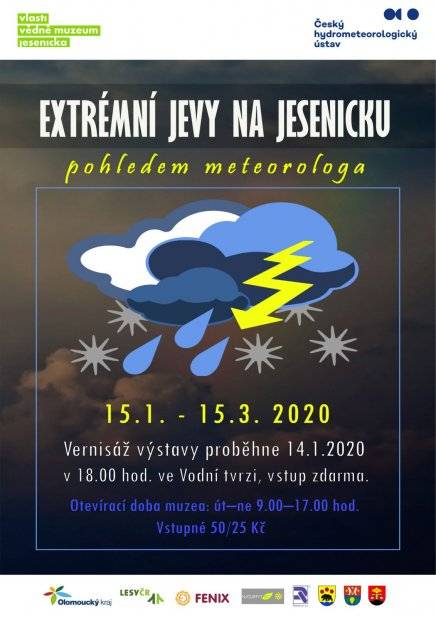 Extrémní jevy na Jesenicku pohledem meteorologa (vernisáž)14.01.2020 14. ledna 2020, Galerie Vodní tvrze Na leden 2020 připravilo Vlastivědné muzeum Jesenicka ve spolupráci s Českým hydrometeorologickým ústavem tematicky ojedinělou výstavu s názvem Extrémní jevy na Jesenicku pohledem meteorologa, která pojednává o výjimečných meteorologických situacích v Jeseníkách a Rychlebských horách v období 1978 až 2017, které jsou možným odleskem klimatických změn. Během vernisáže promluvili mimo jiné Ing. Pavel Lipina, vedoucí oddělení meteorologie a klimatologie ČHMÚ, kurátor výstavy, meteorolog Bc. David Abrahámek a také její spoluautor a zároveň ředitel muzea, Mgr. Pavel Rušar. Vernisáže se vedle řady významných hostů účastnil také ředitel ostravské pobočky ČHMÚ, Ing. Petr Tušil, Ph.D., MBA. Vernisáž proběhla za působivého klavírního doprovodu Karoliny Vítkové ze ZUŠ Jeseník. Návštěvníci se mohou seznámit s průběhem několika vybraných synoptických situací, které jsou zaměřeny na meteorologické extrémy na Jesenicku. Speciální pozornost je věnována bouřkám a bouřkovým jevům, velmi nízkým i extrémně vysokým teplotám, problematice sucha (v poslední době velký problém na velké části ČR), silným nárazům větru, velmi brzkým sněhovým pokrývkám na podzim a naopak pozdním sněhovým pokrývkám na jaře a dalším neobvyklým meteorologickým jevům. Ve výstavě jsou k vidění různé meteorologické přístroje a pomůcky z dob minulých i doby současné, které jsou využívány v „ostrém“ provozu na meteorologických stanicích po celé republice. Návštěvník se může seznámit s odbornou i populární meteorologickou a klimatologickou literaturou doplněnou například starými meteorologickými deníky z 19. století či záznamy žáků o pozorování počasí z doby našich prarodičů i praprarodičů. Perličkami jsou originální aerologická sonda, meteorologická budka s vybavením a funkční automatická meteorologická stanice, kterou si návštěvníci mohou vyzkoušet v praxi. Ke stažení